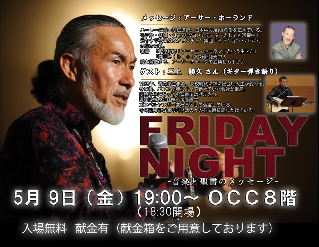 お友達やご家族と一緒にお出でいただけたらうれしいです。主義や信仰などの押し付けは決してありません。フランクな気持ちでどうぞ。「フライデーナイト」との出会いが、あなたと神様との出会いの時となり、あなたの笑顔や喜びや安らかな気持ちを取り戻す時となりますよう、心からお祈りしています。