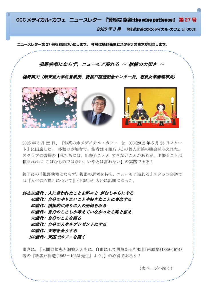 2023年1月のメディカル・カフェ終了後のスタッフ会で樋野先生より励ましがあり、新たにニュースレターを発行することになりました。