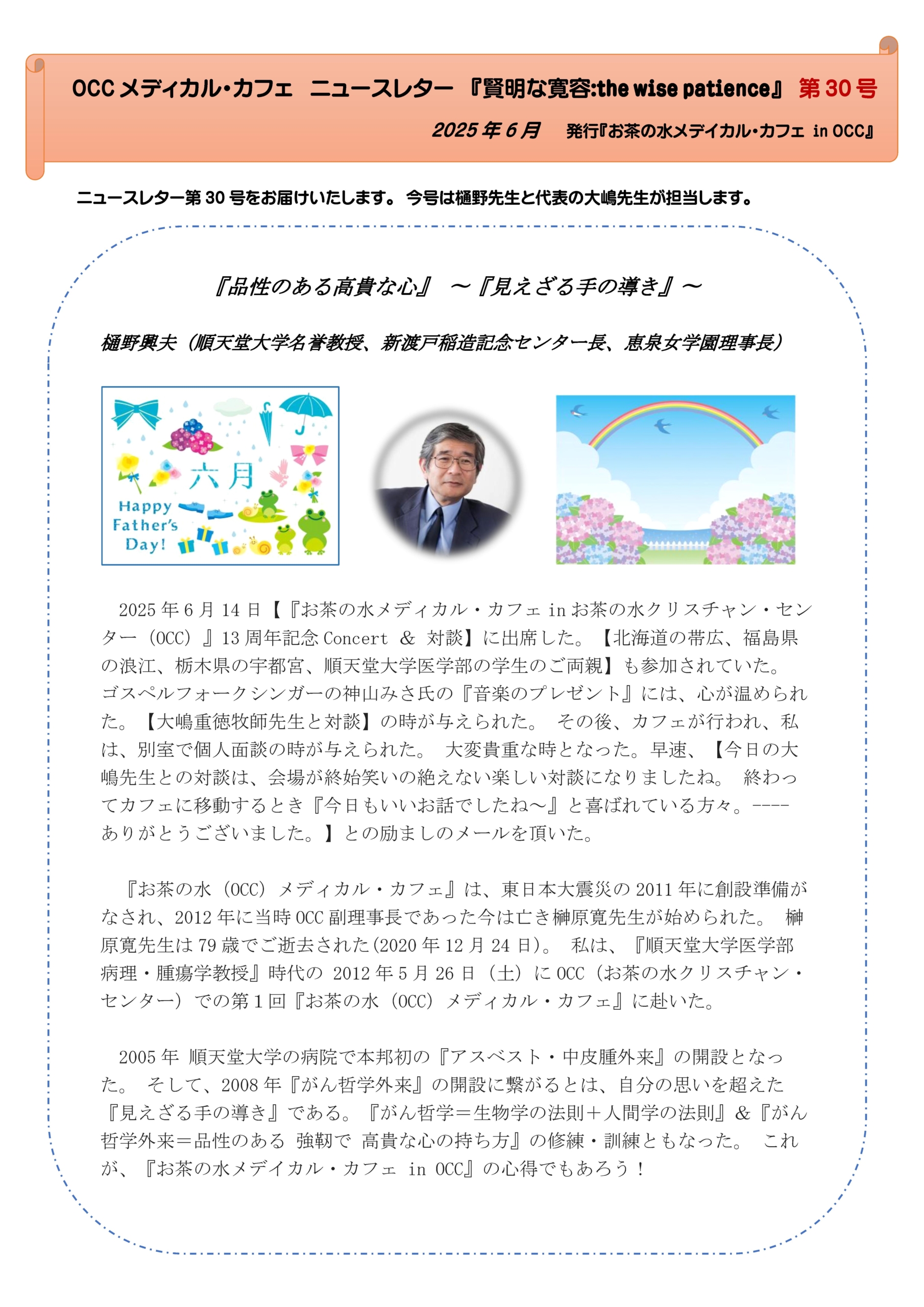 2020年3月、お茶の水クリスチャン・センター(=OCC)副理事長を退かれ4月に顧問に就任。