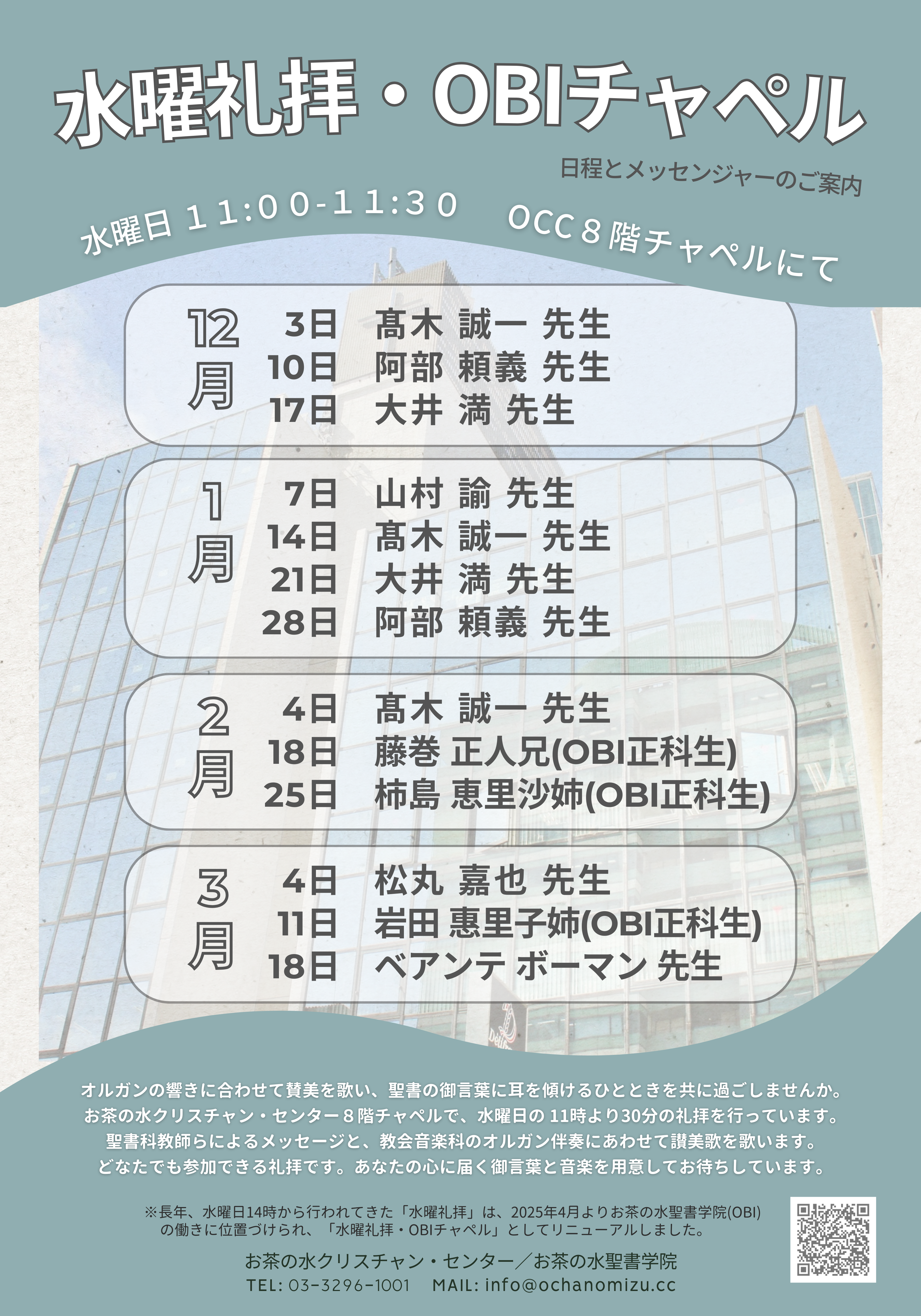 ※長年、水曜日14時から行われてきた「水曜礼拝」は、2025年4月よりお茶の水聖書学院(OBI)の働きに位置づけられ、「水曜礼拝・OBIチャペル」としてリニューアルしました。