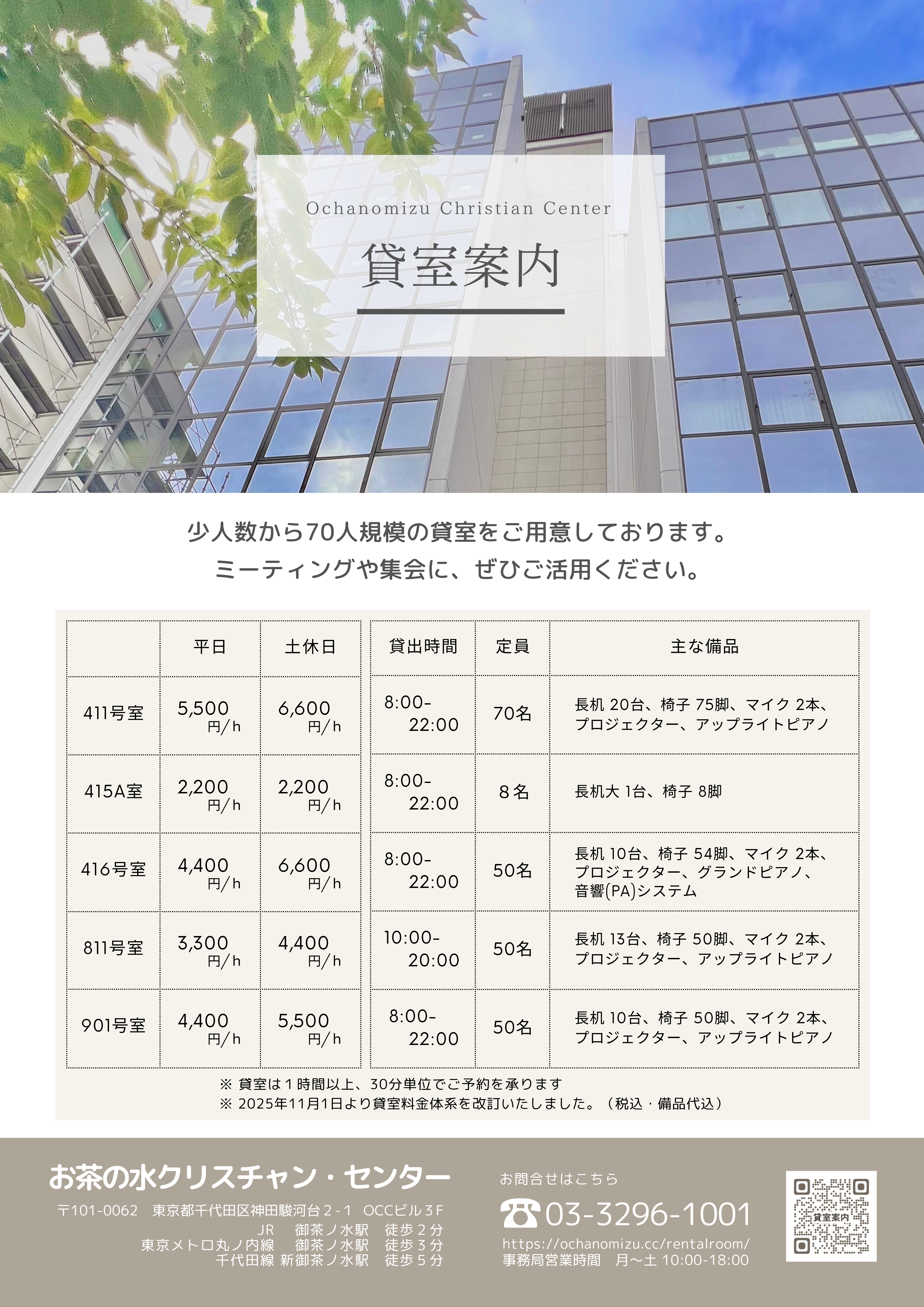 OCC貸会議室/チャペルをお使いの集会に限り、1階サイネージに集会1ヵ月前より表示が可能です。ご所望の方はお申込み後に事務局までメールでご提出ください。なお、集会当日に廊下等の共用部にチラシを貼る、立て看板を立てる等の行為はご遠慮ください。